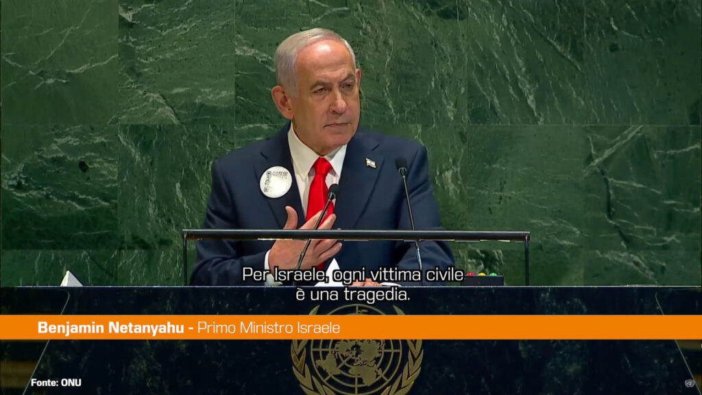 NEW YORK (STATI UNITI) (ITALPRESS) – Il primo ministro israeliano, Benjamin Netanyahu, ha dichiarato davanti all’Assemblea generale delle Nazioni Unite che l’accusa a Israele di genocidio a Gaza è falsa. “Per Israele, ognivittima civile è una tragedia, per Hamas è una strategia. Fa propaganda di guerra e li usa come scudi umani”, ha affermato. Nel suo intervento, Netanyahu ha accusato Hamas di commettere genocidio perché “mentre l’esercito israeliano esorta la popolazione di Gaza a evacuare delle zone, Hamas li obbliga a restare là”.
