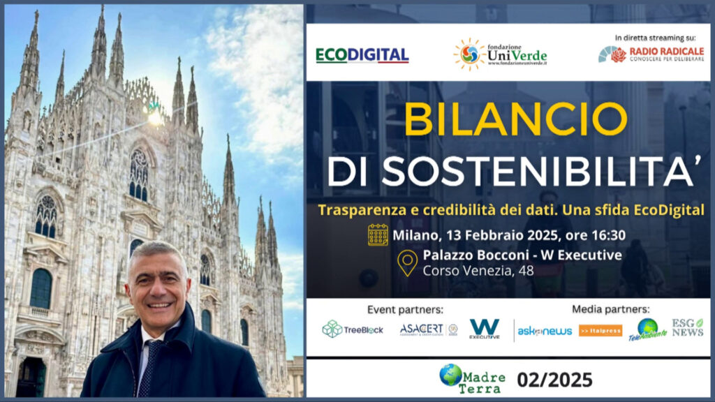 MILANO (ITALPRESS) – “Bilancio di Sostenibilità: trasparenza e credibilità dei dati. Una sfida EcoDigital”: evento promosso dalla Rete EcoDigital e dalla Fondazione UniVerde, in collaborazione con TreeBlock, Asacert. A Milano, giovedì 13 febbraio, ore 16.30, presso W Executive, Palazzo Bocconi (Corso Venezia, 48) e in diretta streaming su Radio Radicale. Tra i media partner Italpress e TeleAmbiente.