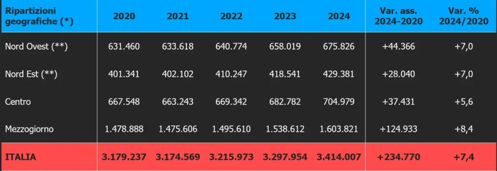 La regione che presenta l’incidenza delle prestazioni di invalidità complessive (previdenziali e civili) sul totale abitanti più elevata è la Calabria (13,2%). Seguono la Puglia (11,6), l’Umbria (11,3) e la Sardegna (10,7). Chiudono Piemonte, Lombardia e Veneto tutte con il 5,1%. A livello provinciale svetta il risultato di Reggio Calabria (14,99 prestazioni erogate ogni 100 abitanti). Subito dopo scorgiamo Lecce (14,24) e Crotone (13,88). Le realtà territoriali meno “interessate” dal fenomeno dell’inabilità sono Trieste (4,39 per cento), Firenze (4,12) e Prato (3,89). Se facciamo un focus solo sulle pensioni erogate agli invalidi civili, nel 2024 la spesa complessiva, come dicevamo più sopra, è stata di 21 miliardi di euro; quasi la metà (il 46,6% del totale) viene erogata nel Mezzogiorno. L’importo annuale più importante pari a 2,73 miliardi viene corrisposto alla Campania. Seguono i 2,67 miliardi dati in Lombardia e i 2,38 miliardi dovuti al Lazio. L’importo mensile medio nazionale è di 501 euro. Tornando a osservare l’andamento del numero delle pensioni di invalidità civile, tra il 2020 e il 2024 la regione che ha subito l’incremento percentuale più elevato è stata la Puglia (+14,1 per cento). Seguono la Basilicata (+12,2) e la Calabria (+11,9). Per contro, le realtà dove l’aumento è stato più contenuto sono la Toscana (+2,7) e il Friuli Venezia Giulia (+2,6).