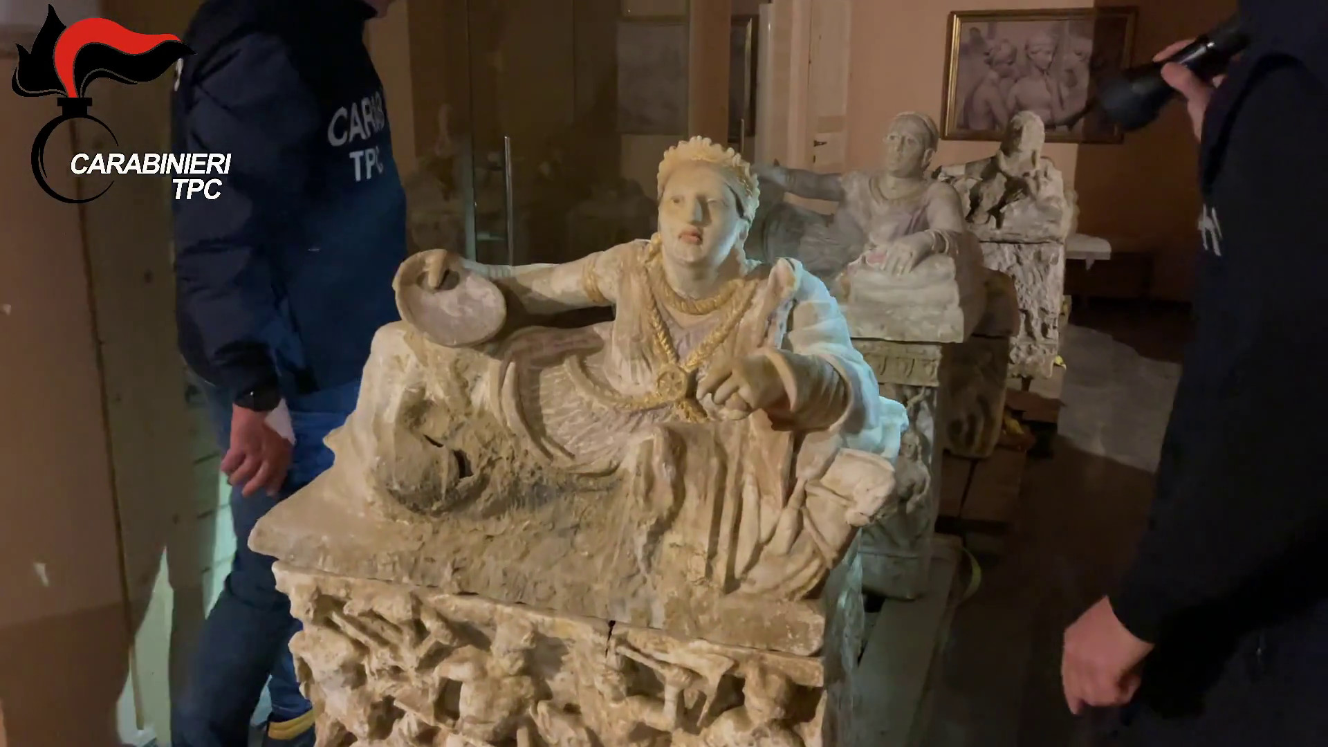 PERUGIA (ITALPRESS) – I Carabinieri del Comando Tutela Patrimonio Culturale hanno scoperto uno scavo abusivo nella zona fra Chiusi e Città della Pieve nel territorio di quest’ultimo comune ed il ritrovamento di importanti reperti archeologici etruschi. In particolare, venivano individuate quali eventuali responsabili due persone, nei confronti delle quali si procede per i reati di furto e ricettazione di beni culturali e soprattutto sequestrate 8 urne litiche etrusche, due sarcofagi e il relativo corredo funerario di età ellenistica del III secolo a.C. Le urne, tutte integre, sono in travertino bianco umbro, in parte decorate ad altorilievi con scene di battaglie, di caccia e con fregi, alcune delle quali conservano pigmenti policromi e rivestimenti a foglia d’oro, altre con la raffigurazione del mito di Achille e Troilo. Dei due sarcofagi, uno è al momento rappresentato dalla sola copertura e l’altro completo dello scheletro del defunto. Un preliminare studio scientifico delle urne redatto dai funzionari archeologi del Ministero della Cultura conferma l’appartenenza dei beni a un unico contesto funerario, consistente in una tomba a ipogeo riconducibile a una importante famiglia del luogo, i “PULFNA”. Particolarmente ricco il corredo funebre (suppellettili e vasellame, fittile e metallico) tra cui quattro specchi in bronzo, uno dei quali con l’antica divinizzazione di Roma e della lupa che allatta soltanto Romolo, un balsamario contenente ancora tracce organiche del profumo utilizzato in antichità, un pettine in osso, situle e oinochoe in bronzo, comunemente utilizzati dalle donne etrusche durante banchetti e simposi.tvi/gsl